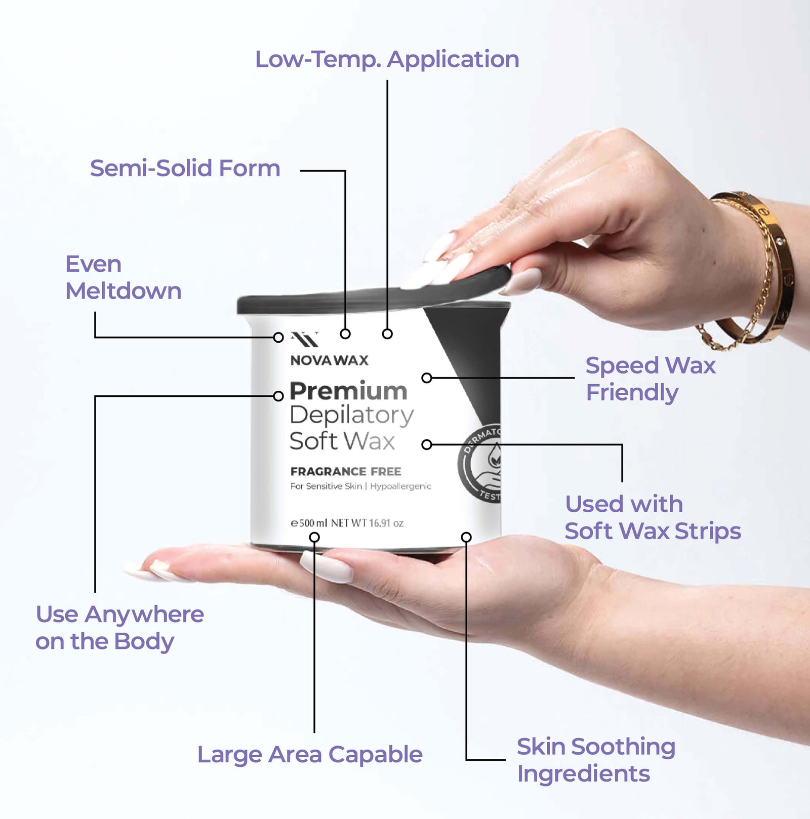 Formulated in Europe with Premium ingredients our vegan friendly soft wax formula is gentle and suitable for use on all skin types also all areas of the body. Your clients will notice the Nova Difference. New to Nova? Try your first can on us. Complete the Samples Request form at the bottom of the page to receive a coupon code for a complimentary first can.. Offer valid for Pros or Businesses.